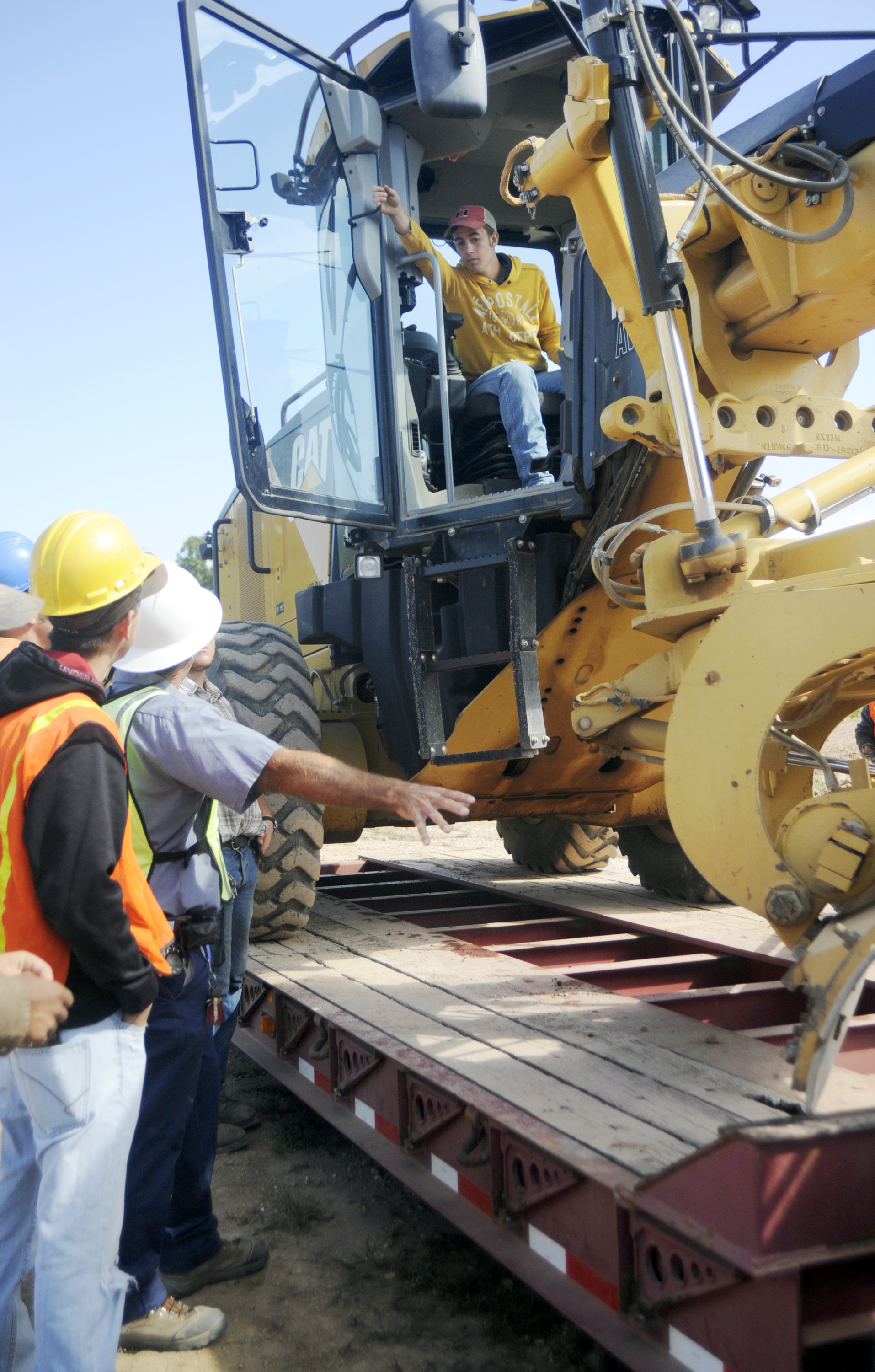 Image: Instructor Gary Radmacher, second left in white hard hat, gives some pointers to a student about backing a road grader off of a trailer Wednesday, Sept. 7, 2011, at Linn State Technical College in Linn, Mo. On Wednesday, the central Missouri school began conducting drug screens for all new students and any returning after an extended break in attendance. Students in some programs, such as these in the Heavy Equipment Operating program, already were subject to the tests because of federal requirements for commercial drivers’ licenses.(AP Photo/Kelley McCall)