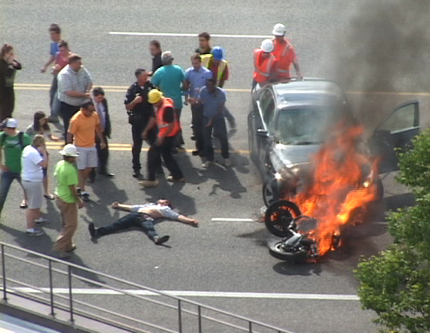 Image: In this Monday, Sept. 12, 2011 image taken from video, a group of people are directed away from the scene by police after tilting a burning BMW up to free Brandon Wright, on his back on the ground, who was pinned underneath after he collided with the car while riding his motorcycle on U.S. 89 in Logan, Utah. Authorities said Wright was riding his motorcycle near the Utah State University campus in Logan when the 21-year-old collided with the BMW that was pulling out of a parking lot. Tire and skid marks on the highway indicate that Wright laid the bike down and slid along the road before colliding with the car, Assistant Police Chief Jeff Curtis said. (AP Photo/Chris Garff)