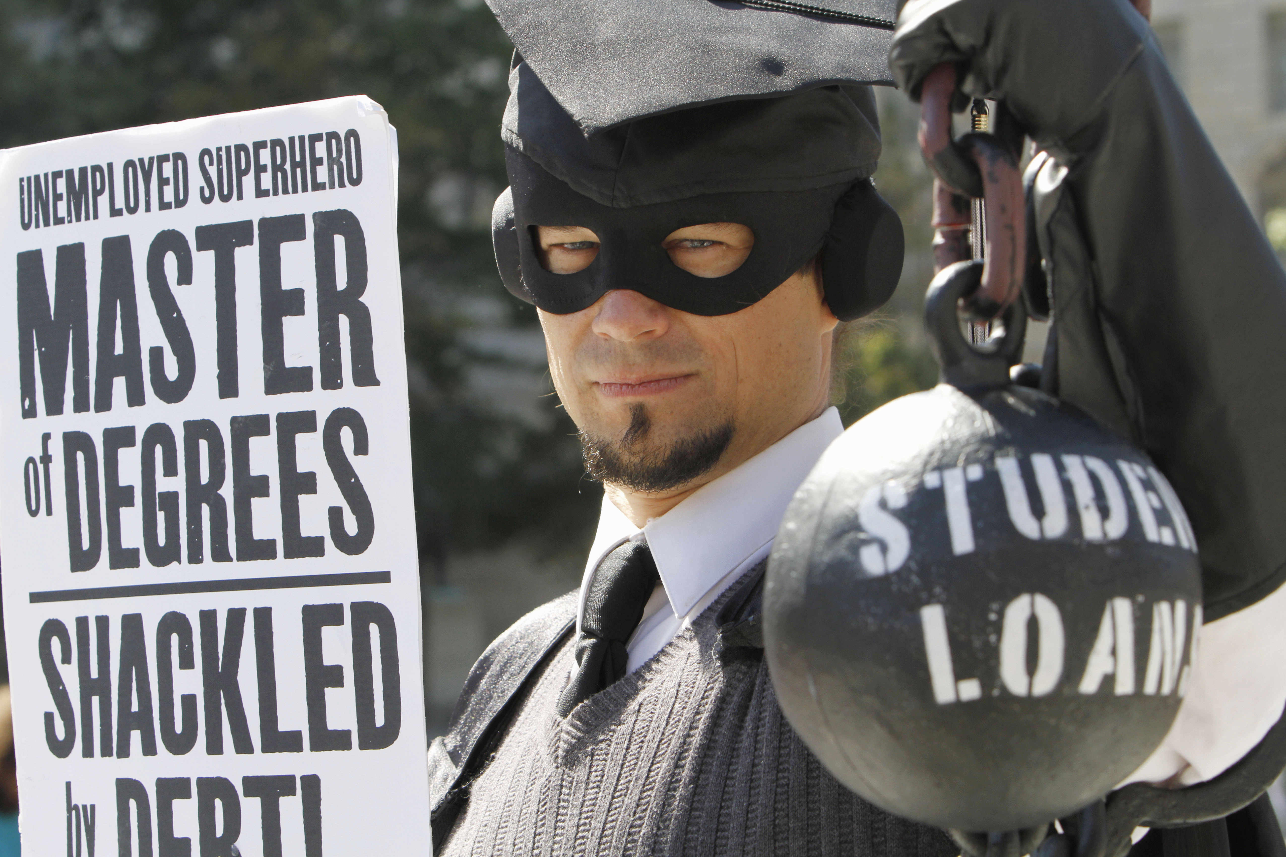 Image: Gan Golan, of Los Angeles, dressed as the “Master of Degree,” holds a ball and chain representing his college loan debt, as several groups including the Peoples Uprisings, October2011 Coalition, and Occupy DC, “occupy” Freedom Plaza in Washington, Thursday, Oct. 6, 2011. The groups held signs against war and “corporate greed.” (AP Photo/Jacquelyn Martin)