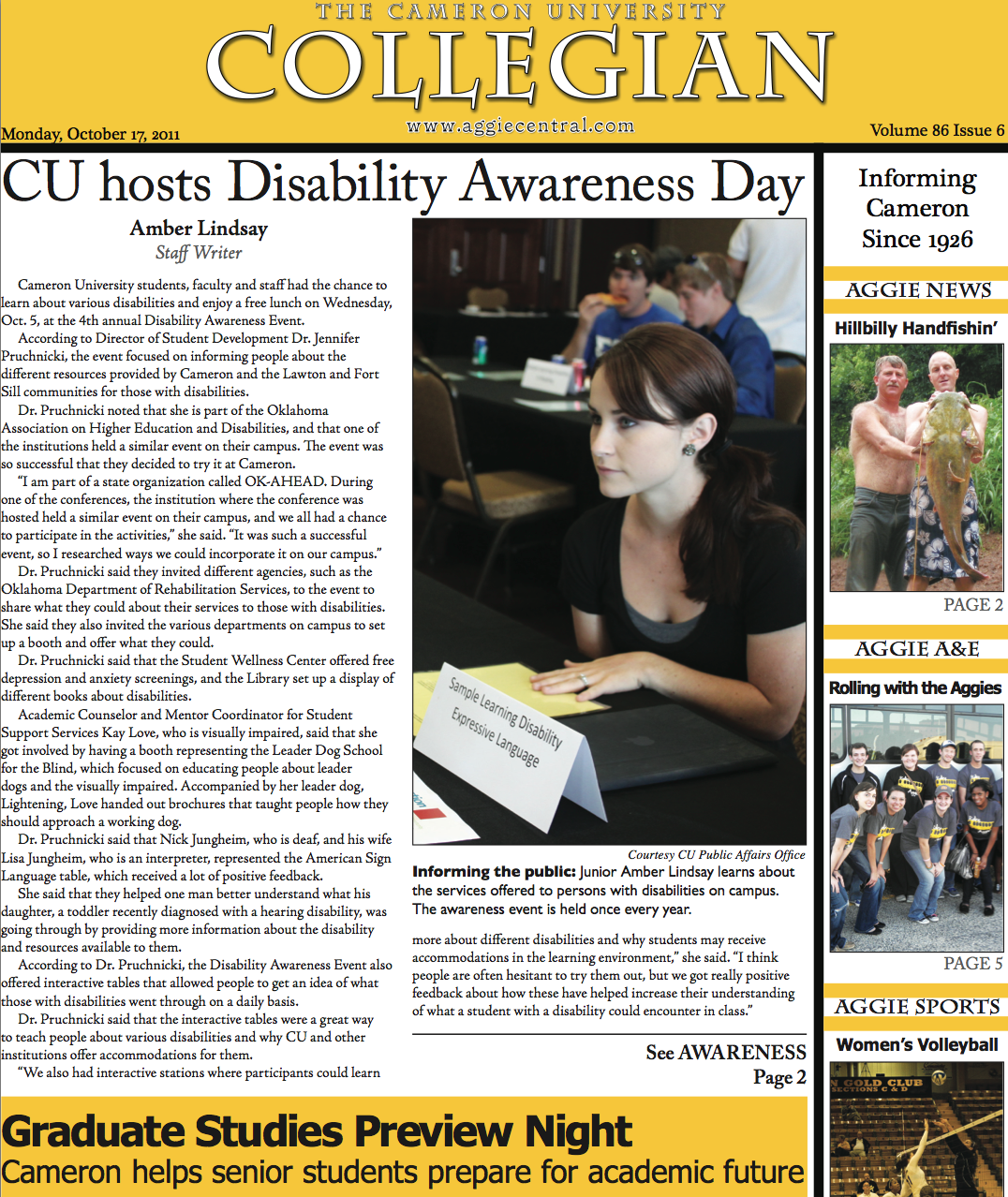 Click here to read or download the Oct. 17, 2011 edition of the Cameron University Collegian. This is the sixth issue of the Collegian for the Fall 2011 semester.