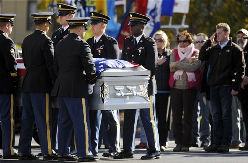 IMAGE: Family and friends look-on as a Military Funeral Honors Team from the Connecticut Army National Guard carries the casket of U.S. Army Staff Sgt. Ari R. Cullers into Nielan Funeral Home in New London, Conn., Monday, Nov. 7, 2011. Cullers, 28, of New London, died Oct. 30 in Kandahar Province, Afghanistan when enemy forces attacked his unit with a rocket-propelled grenade, according to the Defense Department. He was a mechanic assigned to the 3rd Brigade Special Troops Battalion, 3rd Brigade Combat Team, 10th Mountain Division in Fort Drum, N.Y. (AP Photo/The Day, Sean D. Elliot)