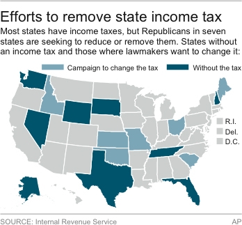 Nine states already get by without an income tax, mostly by tapping other sources of revenue. Nevada and Florida rely on sales taxes that target the tourism industry. Alaska has taxes on natural resources, and Texas imposes substantial property taxes. The other five states are: New Hampshire, South Dakota, Tennessee, Washington and Wyoming.