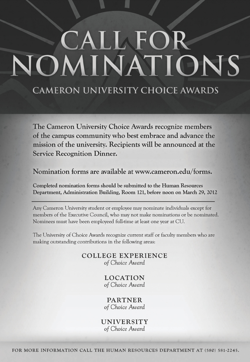 The nomination process for the Cameron University Choice Awards began this month in preparation for this year’s Service Recognition Reception and Dinner on April 17. The annual awards, which began in 2009, are given in four different categories related to Cameron University’s “Plan 2013: Choices for the Second Century.”