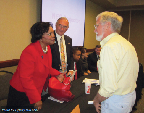 Chair, Oklahoma State Democratic Party, discuss PPACA with an audience member. The public forum over health care reform was held at the CETES building Sept. 14.