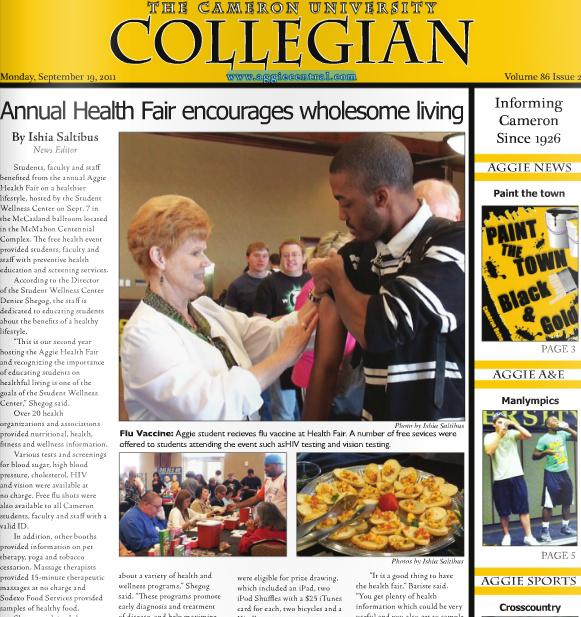 Click here to read or download the Sept. 19, 2011, edition of the Cameron University Collegian. This is the second issue of the Collegian for the Fall 2011 semester.